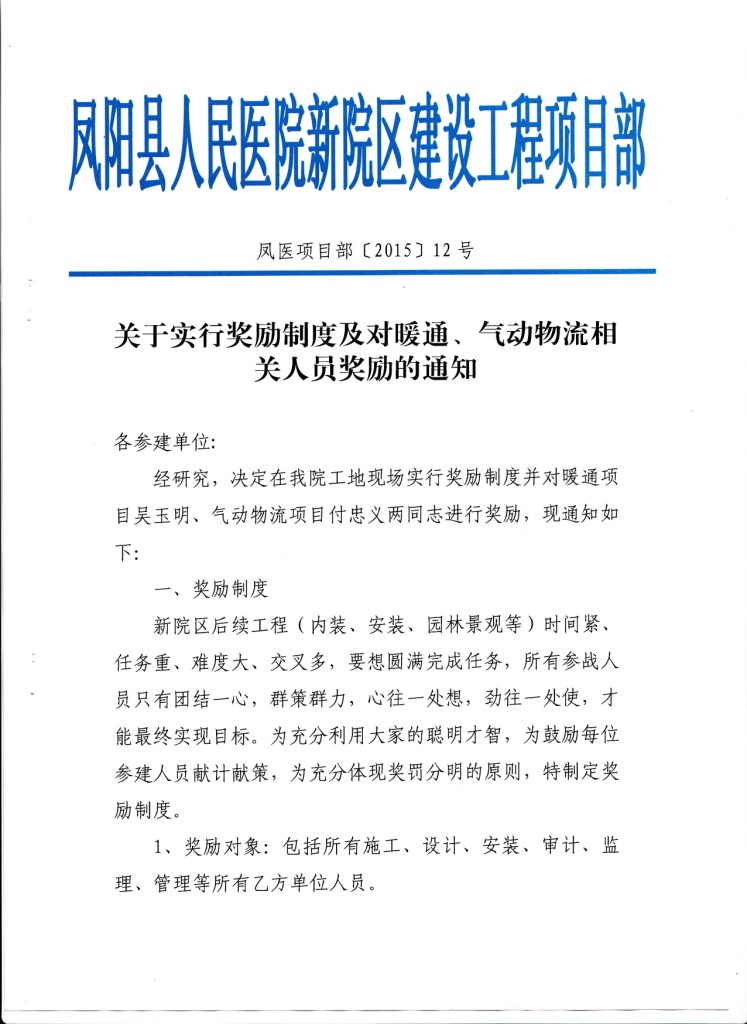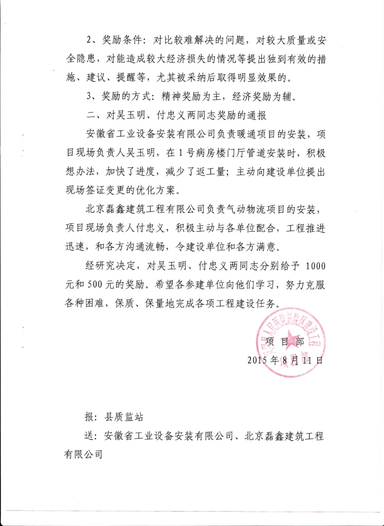 8月11日,鳳陽(yáng)縣人民醫(yī)院新院區(qū)建設(shè)工程項(xiàng)目部發(fā)來賀文,就公司第九分公司承攬的鳳陽(yáng)縣人民醫(yī)院新院區(qū)暖通項(xiàng)目安裝工程表示肯定,并對(duì)該項(xiàng)目的現(xiàn)場(chǎng)負(fù)責(zé)人吳玉明同志給予表彰和獎(jiǎng)勵(lì)通報(bào)。