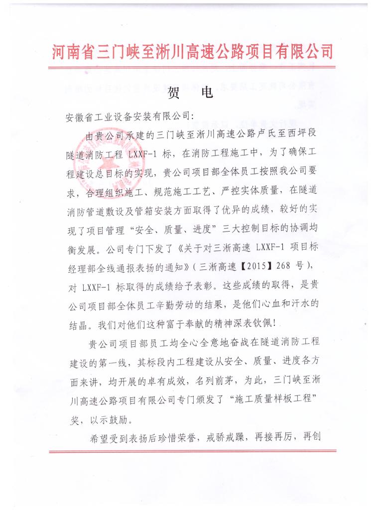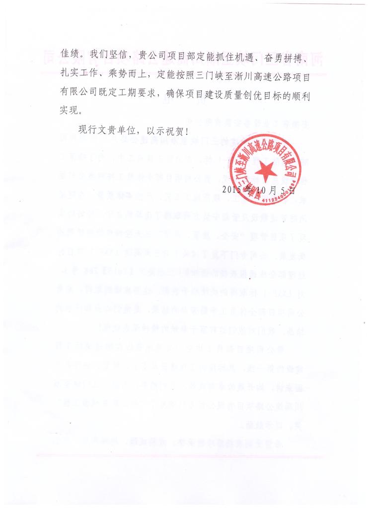 10月5日,公司收到河南省三門峽至淅川高速公路項(xiàng)目有限公司發(fā)來(lái)的賀電,信中對(duì)公司西北分公司在承建三門峽至淅川高速公路盧氏至西坪段隧道消防工程LXXF-1標(biāo)施工中,項(xiàng)目部合理組織施工、規(guī)范施工工藝、嚴(yán)控實(shí)體質(zhì)量,較好地實(shí)現(xiàn)了項(xiàng)目“安全、質(zhì)量、進(jìn)度”三大控制目標(biāo)協(xié)調(diào)均衡發(fā)展表示高度贊揚(yáng),對(duì)項(xiàng)目部全體員工辛勤勞動(dòng)、無(wú)私奉獻(xiàn)表示衷心感謝,并給予表彰和獎(jiǎng)勵(lì)。