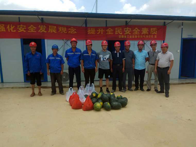 烈日炎炎,酷暑難當(dāng),6月28日上午,安裝安裝第四分公司經(jīng)理趙永峰在分公司副經(jīng)理姜田斌,工程科、安全科負(fù)責(zé)人的陪同下,來到廣東省清遠(yuǎn)市印染行業(yè)污水處理項(xiàng)目,看望和慰問奮戰(zhàn)在一線的員工,為他們送去綠豆、白糖、西瓜、藿香正氣水、十滴水、仁丹等防暑降溫物品,實(shí)地察看了項(xiàng)目工地和職工生活區(qū),并與項(xiàng)目同志進(jìn)行了座談交流 。