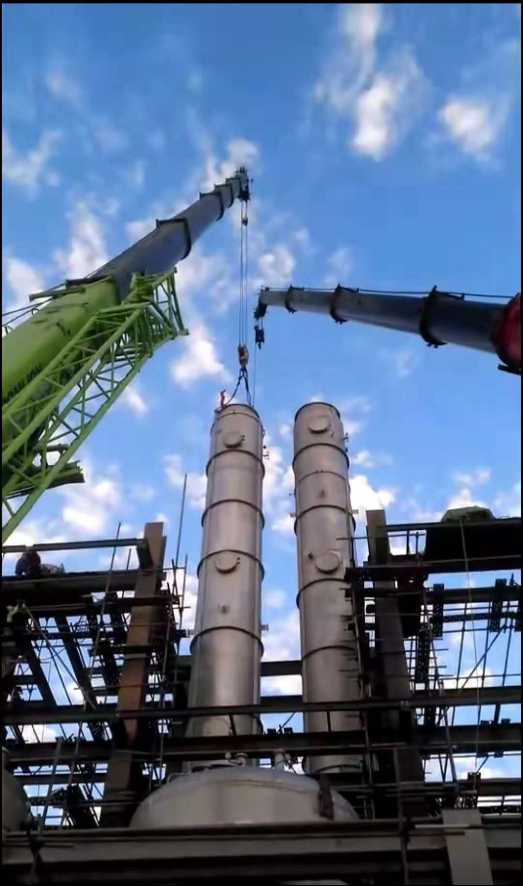 項目部積極安排施工人員,優(yōu)化吊裝方案,經(jīng)過各方面積極配合,此次輕組分塔、純苯酐塔吊裝施工的順利完成得到了業(yè)主的認(rèn)可,為該項目后續(xù)工作的開展打下了堅實的基礎(chǔ)。