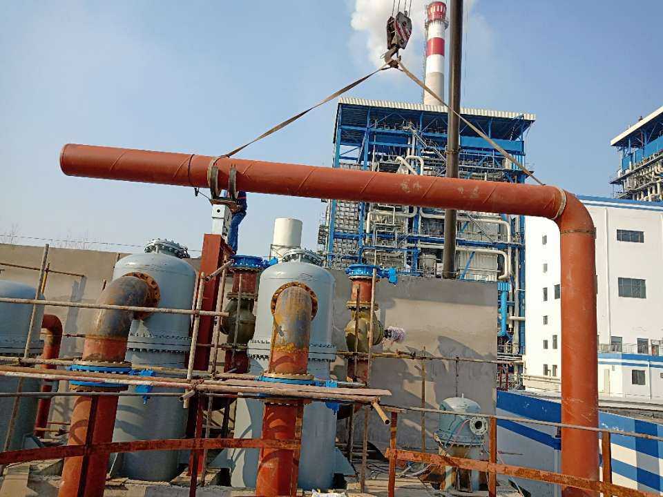 阜陽國禎供熱首站機(jī)電安裝工程蒸汽管道施工內(nèi)容包括Φ630蒸汽管道在8.5m的高空架設(shè)、彈簧支架及槽鋼支架的敷設(shè)、與換熱器進(jìn)出口的對(duì)接等;因施工現(xiàn)場存在場地小、作業(yè)面狹窄等諸多困難,蒸汽管道架空敷設(shè)任務(wù)異常艱巨。此次蒸汽管道吊裝,項(xiàng)目部提前合理部署,多次優(yōu)化方案,在各方力量的通力配合下,齊心協(xié)力,圓滿地完成架空敷設(shè)任務(wù),整個(gè)吊裝過程平穩(wěn)、安全,獲得了業(yè)主方的贊許與肯定。
