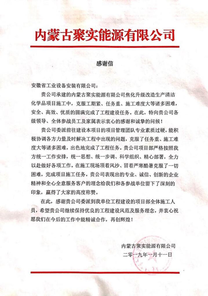 2019年1月14日,安徽安裝承建的內(nèi)蒙古聚實能源有限公司焦化升級改造生產(chǎn)清潔化學品項目,克服工期緊、任務重、施工難度大等諸多困難,安全、高效、優(yōu)質(zhì)的圓滿完成了工程建設任務。業(yè)主內(nèi)蒙古聚實能源公司總經(jīng)理張春軍向公司贈送內(nèi)容為“力克萬難 保中交節(jié)點;眾志成城 創(chuàng)優(yōu)質(zhì)履約”的錦旗。