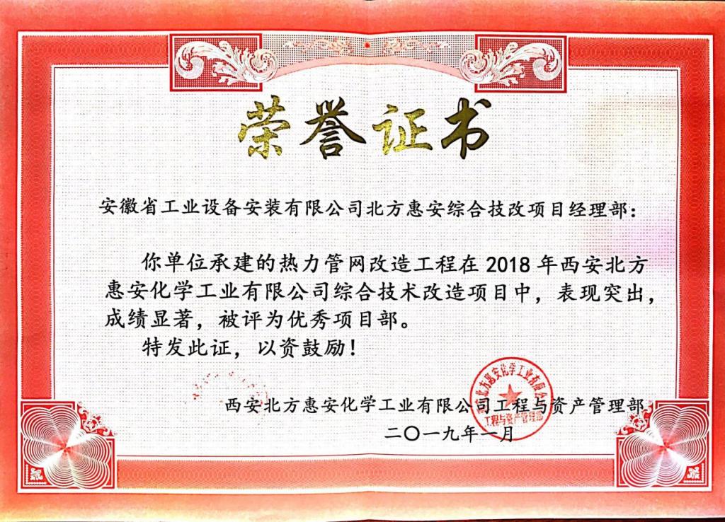 近日,安徽安裝承建的西安北方惠安化學(xué)工業(yè)有限公司綜合技改項目熱力管網(wǎng)改造工程,經(jīng)項目部全體人員共同努力,保質(zhì)保量地完成了業(yè)主的節(jié)點目標(biāo),贏得了業(yè)主高度認(rèn)可和好評,被業(yè)主授予“優(yōu)秀項目部”榮譽稱號,成為各參建單位的標(biāo)桿,業(yè)主特別頒發(fā)了榮譽證書和感謝信感謝項目全體人員所作出的貢獻,