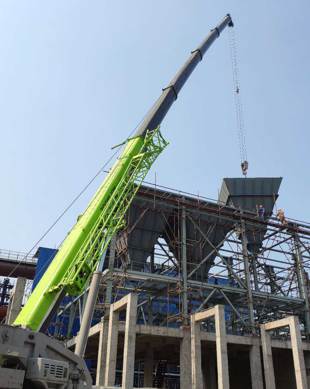 本次吊裝的反應(yīng)器灰斗部分總重量達(dá)56噸,吊裝作業(yè)存在場地狹小、與土建單位交叉作業(yè)多、吊重荷載大等諸多困難,吊裝任務(wù)異常艱巨。為此,項(xiàng)目部提前合理部署,多次優(yōu)化吊裝方案,按照方案要求采用額定荷載為100噸的汽車實(shí)施吊裝作業(yè)。項(xiàng)目部在設(shè)備吊裝前對(duì)全體“參戰(zhàn)”人員進(jìn)行了現(xiàn)場安全技術(shù)交底,明確施工工序、技術(shù)要點(diǎn)難點(diǎn)和安全風(fēng)險(xiǎn)點(diǎn),做到分工明確、責(zé)任到位,吊裝工作有條不紊地展開。在各方力量的通力配合下,經(jīng)過六個(gè)多小時(shí)的奮戰(zhàn),項(xiàng)目部終于完成了10臺(tái)灰斗以及現(xiàn)場輔助設(shè)備的吊裝任務(wù)。