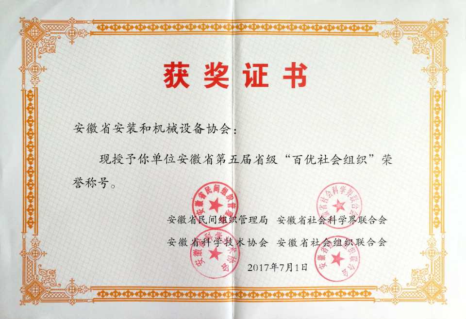 2017年7月,安徽省安裝和機械設備協(xié)會第三次榮獲安徽省第五屆省級“百優(yōu)社會組織”稱號,并由安徽省民間組織管理局、安徽省社會科學界聯(lián)合會、安徽省科學技術協(xié)會、安徽省社會組織聯(lián)合會聯(lián)合頒發(fā)了榮譽證書。