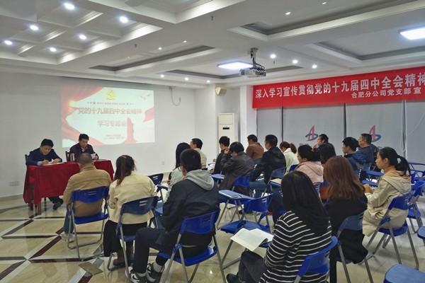 為深入學(xué)習(xí)宣傳貫徹黨的十九屆四中全會精神,打牢政治基礎(chǔ),堅定政治方向,11月13日下午3點,合肥分公司黨支部在公司十五樓職工之家組織召開黨的十九屆四中全會精神學(xué)習(xí)專題會,分公司領(lǐng)導(dǎo)班子成員、機關(guān)全體黨員干部及在肥項目部人員參加了會議,會議由黨支部書記胡迎東主持。