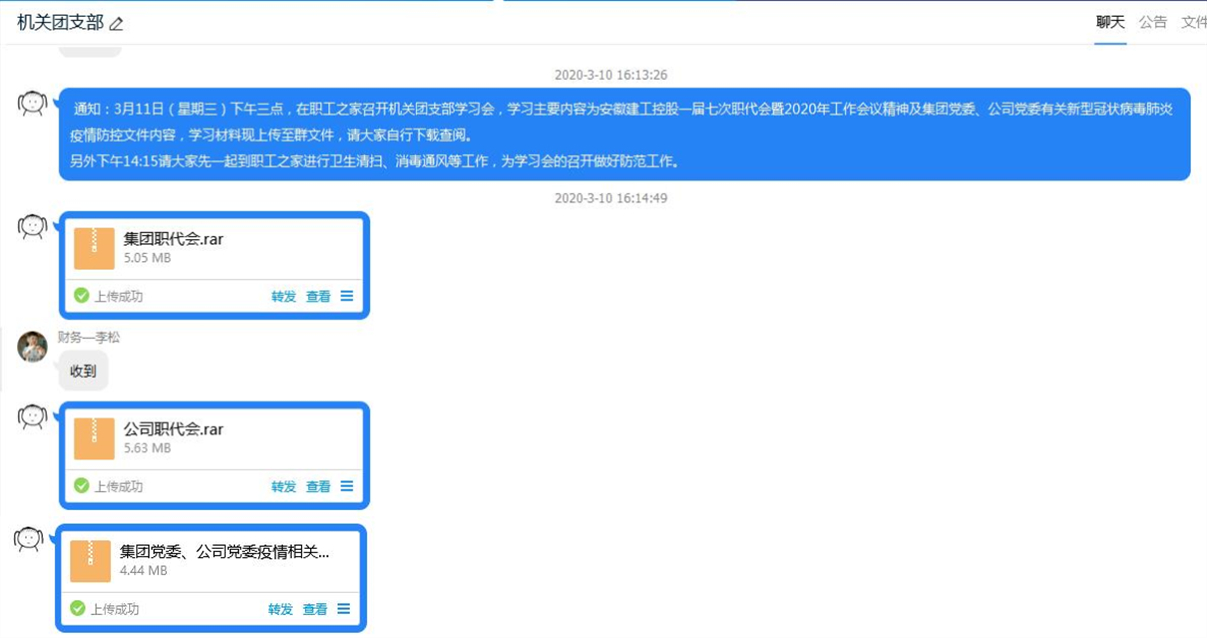本次理論學習會為了縮短會議時間,采取集中學習與個人學習相結(jié)合的方式。會前已將學習材料分享至群文件,供大家自學查閱。會上全體團員集中學習了安徽建工控股一屆七次職代會精神、安徽安裝第十六屆七次職代會精神及《安徽安裝公司關(guān)于切實做好復(fù)工復(fù)產(chǎn)前疫情防控工作的通知》文件精神。