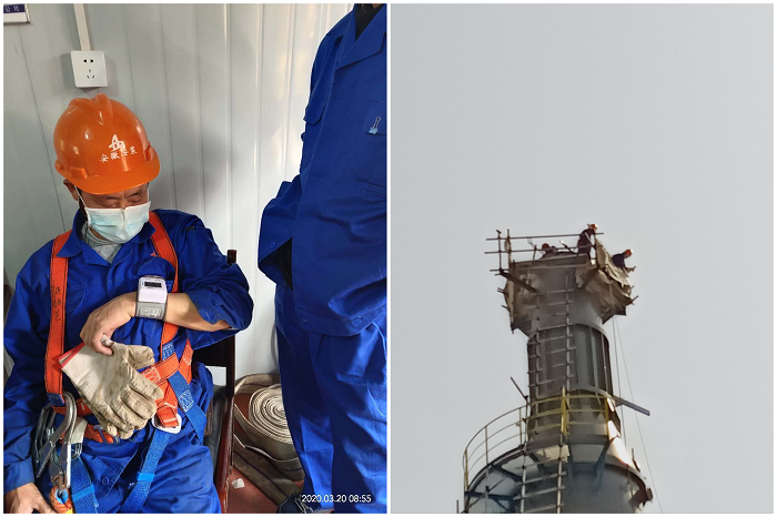面對Ⅲ級高空作業(yè),項目部從對登塔作業(yè)人員的篩選開始就不敢有半點大意,除了項目技術(shù)負責(zé)人、安全負責(zé)人分別進行技術(shù)和安全交底外,還仔細檢查了登塔人員體檢報告,并在登塔作業(yè)前逐一對其進行血壓測量,確保高處作業(yè)人員身體狀況穩(wěn)定。同時,配備對講機,保障上下作業(yè)人員密切配合,順利吊裝,還要對作業(yè)平臺和周圍區(qū)域滿鋪防火布,設(shè)置接火盆,避免塔體下方易燃易爆風(fēng)險,以此杜微慎防,確保萬無一失。11時28分,脫硫塔上段吊裝正式開始。在場人員個個屏息凝神,目光隨著脫硫塔一起移動,思緒跟著脫硫塔一起飆高,“慢慢的...升一點...往西偏一點點...好!停!...降,慢一點...降降降,好!”終于完成上段吊裝環(huán)節(jié)作業(yè),所有人懸著的心都放下來了,但是任務(wù)還沒徹底完成,接下來就是更重要的對口、焊接環(huán)節(jié)。由于要進入塔內(nèi)進行對口焊接,為了保障作業(yè)人員的生命安全,配備氣體檢測儀,以測量塔內(nèi)氧氣濃度是否正常,無硫化氫和可燃性氣體是否超標(biāo)。