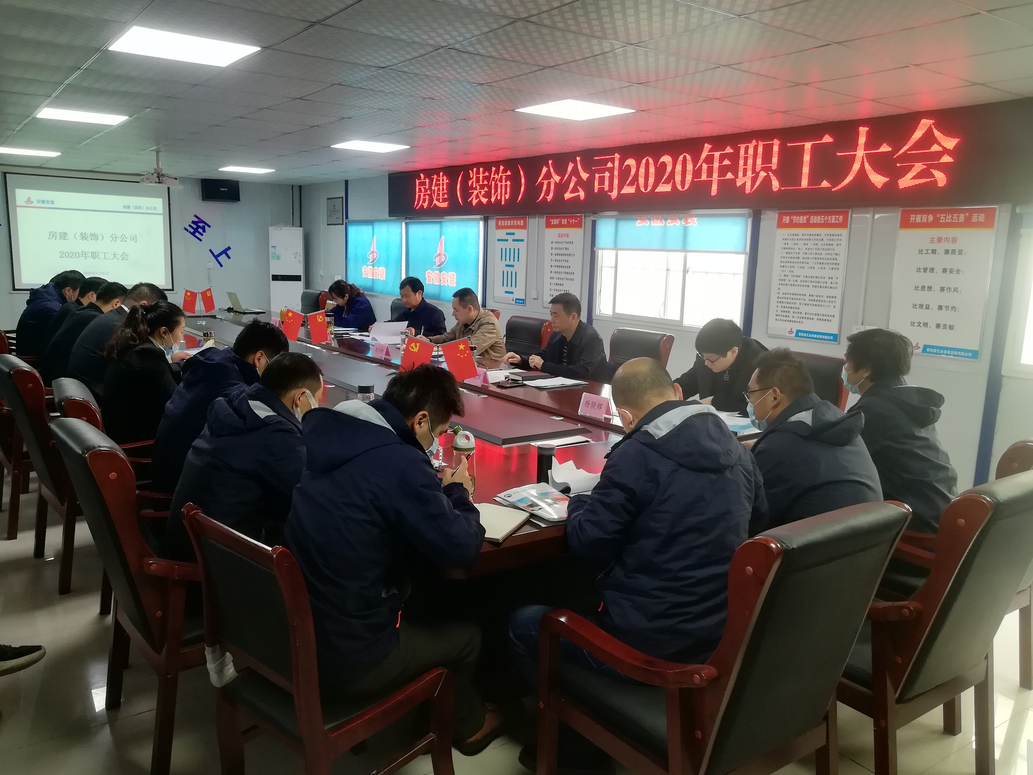4月8日上午,安徽安裝公司房建(裝飾)分公司在阜陽市潁東區(qū)中醫(yī)院建設(shè)PPP項目部召開2020年職工大會。公司黨委書記、董事長胡六中,副總經(jīng)理高飛,紀(jì)委書記、工會主席李寬旭出席大會,人力資源部負(fù)責(zé)人及黨辦相關(guān)人員、分公司班子成員及機關(guān)、阜陽市潁東區(qū)中醫(yī)院建設(shè)PPP項目、淮北恒基城項目部分員工參加會議。會議由分公司黨支部副書記張曼主持。
