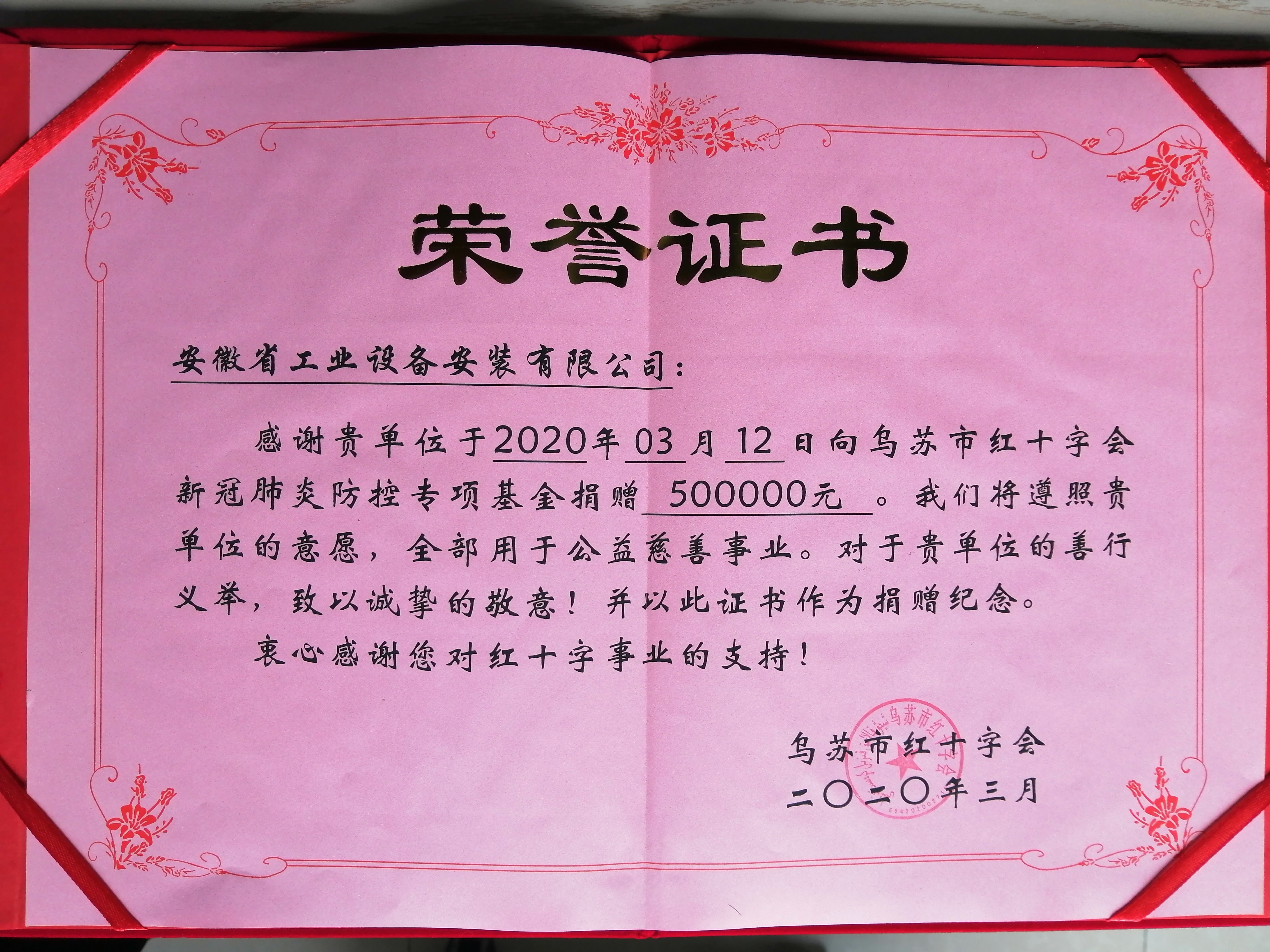 3月12日,安徽安裝公司向新疆烏蘇市紅十字會捐款50萬元,助力打贏疫情防控阻擊戰(zhàn)。