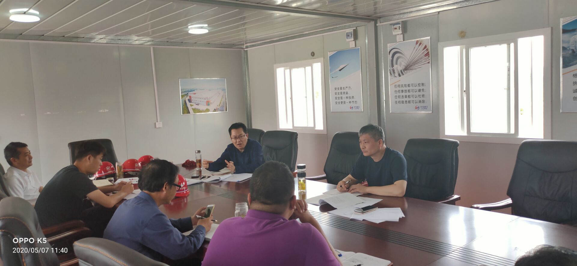 吳繼成一行首先對施工現(xiàn)場進(jìn)行勘察及檢查,隨后召開專題會議,圍繞項目40米跨度吊裝工序進(jìn)行質(zhì)量安全技術(shù)交底工作。同時,他強(qiáng)調(diào),一要提前做好吊裝作業(yè)的各項準(zhǔn)備,計劃好吊裝路線,確保高空作業(yè)人員安全;二要做好高強(qiáng)螺栓扭矩及抗滑移檢測工作,確保螺栓終凝工序符合技術(shù)要求;三要重視現(xiàn)場材料的成品保護(hù),確保整個工程的施工質(zhì)量。