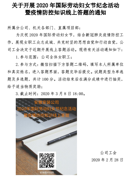 鑒于當(dāng)前新冠肺炎疫情防控特殊時(shí)期,本著不聚集、少聚集的原則,安徽安裝公司工會(huì)組織全公司八十多名女職工參加了疫情防控和《婦女權(quán)益保障法》等知識(shí)的學(xué)習(xí),利用微信平臺(tái)開展了線上答題活動(dòng),活動(dòng)一推出,廣大女職工立即響應(yīng),熱情高漲,對(duì)于不太清楚的問(wèn)題,主動(dòng)查閱相關(guān)資料,與身邊的同事討論,對(duì)模棱兩可的問(wèn)題,仔細(xì)斟酌精確作答。通過(guò)此次答題活動(dòng),全公司范圍內(nèi)再一次掀起宣傳疫情防控常識(shí)的熱潮,推動(dòng)公司疫情防控工作的開展,也進(jìn)一步普及了新時(shí)期下女職工的合法權(quán)益。答題活動(dòng)結(jié)束后,對(duì)優(yōu)秀成績(jī)給予獎(jiǎng)勵(lì)。
