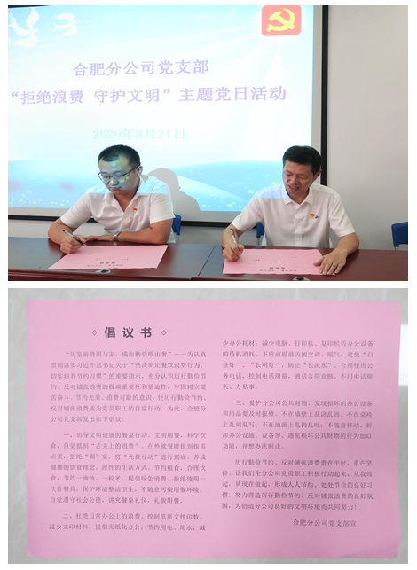 為認真貫徹落實習(xí)近平總書記關(guān)于堅決制止餐飲浪費行為、切實培養(yǎng)節(jié)約習(xí)慣的重要指示精神,牢固樹立艱苦奮斗、節(jié)約光榮、浪費可恥的意識。8月20日下午,合肥分公司黨支部在職工之家組織開展了“拒絕浪費 守護文明”主題黨日活動。分公司黨員職工近60人踴躍參加。