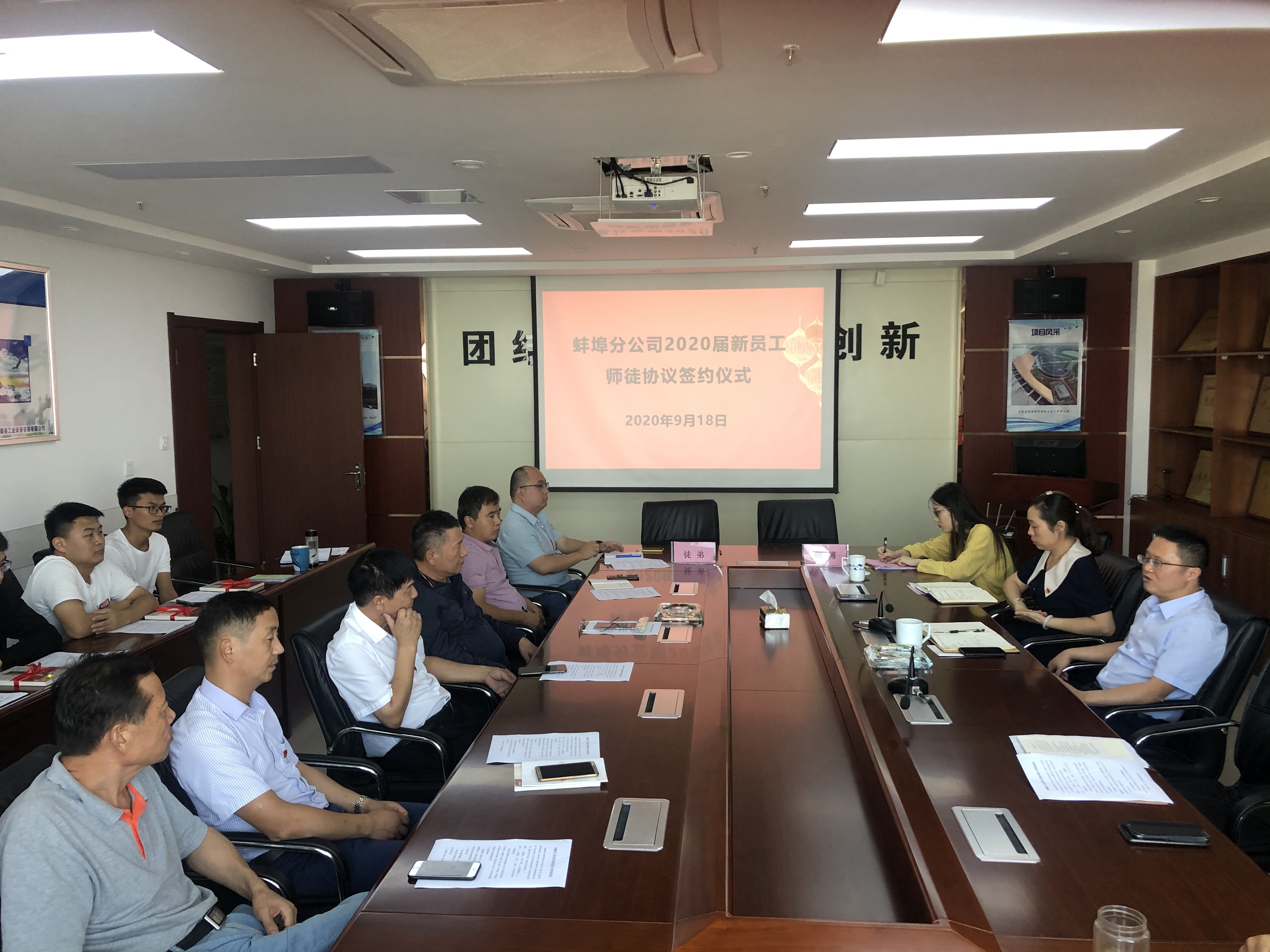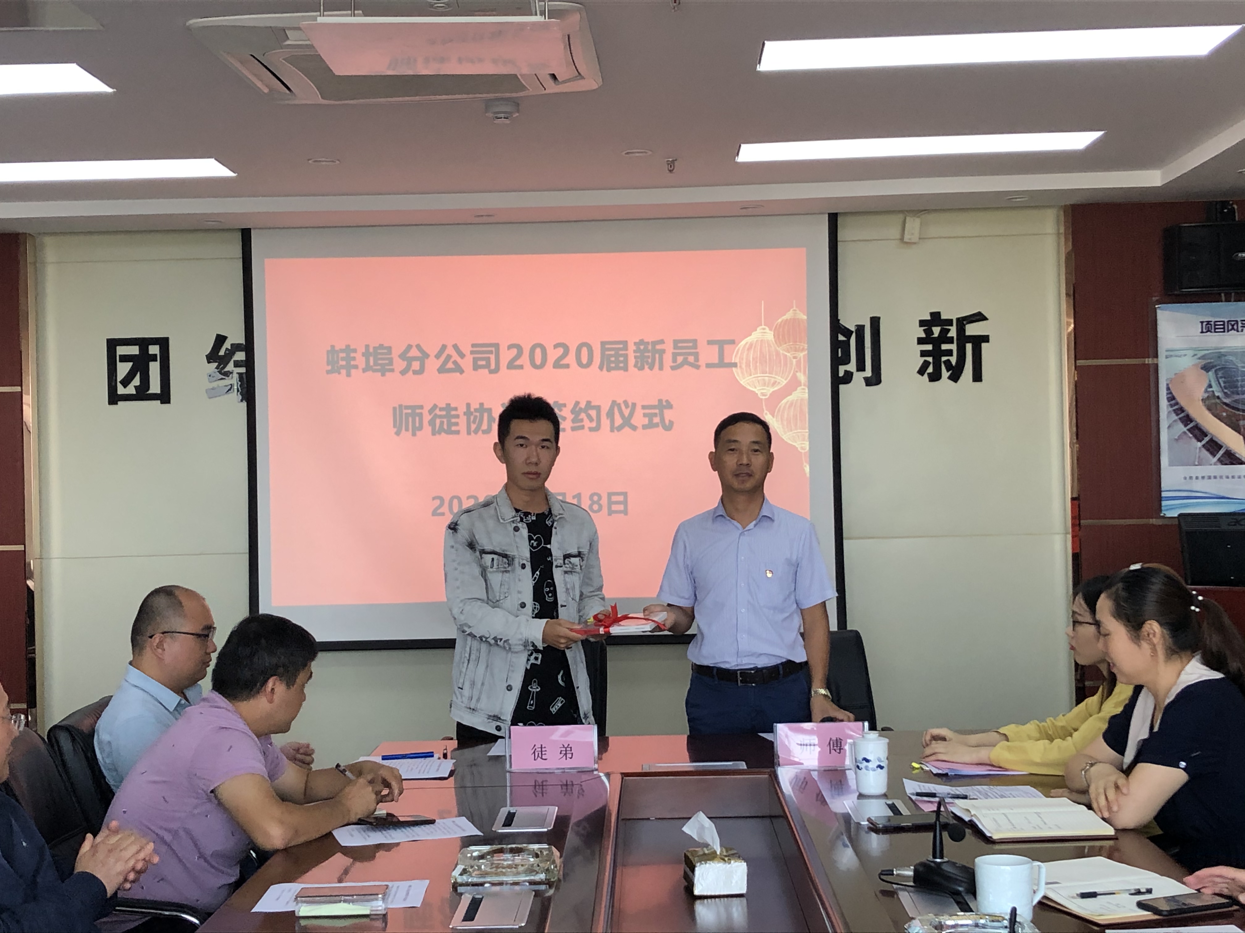 為了幫助新入職大學(xué)生盡快適應(yīng)企業(yè),熟悉工作,勝任崗位,2020年9月18日上午蚌埠分公司黨支部舉行了“2020屆新員工師徒結(jié)對(duì)”簽約儀式。分公司班子成員、部門負(fù)責(zé)人、項(xiàng)目經(jīng)理、師傅及2020屆新入職大學(xué)生參加了此次會(huì)議。