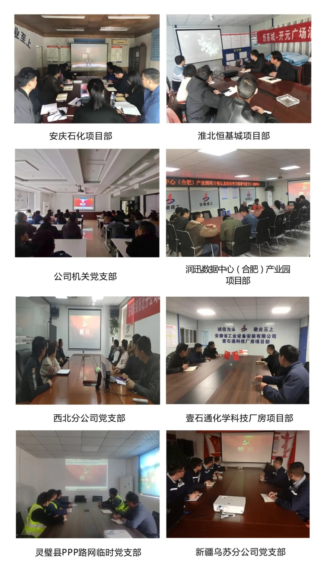 靈璧縣PPP路網(wǎng)臨時黨支部、壹石通化學(xué)科技廠房項(xiàng)目、潤迅數(shù)據(jù)中心(合肥)產(chǎn)業(yè)園項(xiàng)目、蚌埠康寧藥用玻璃管項(xiàng)目、安慶石化項(xiàng)目部于3月22日晚上立即組織共同觀看《榜樣5》,并視頻討論、召開會議等多種形式進(jìn)行學(xué)習(xí)交流。