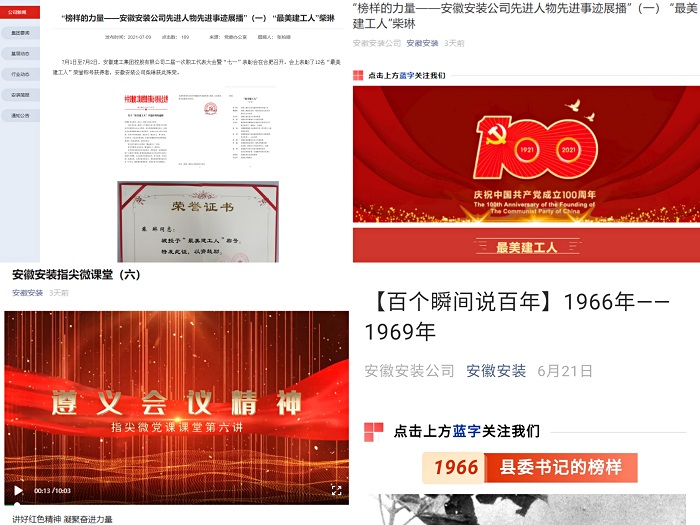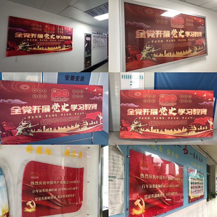 公司黨委第一時(shí)間編印專刊宣傳板報(bào)下發(fā)至所屬各單位和基層項(xiàng)目一線,用好企業(yè)網(wǎng)站、微信公眾號(hào)、電子屏、宣傳欄和所屬各單位、各項(xiàng)目部所有宣傳陣地,在公司網(wǎng)站、微信公眾號(hào)先后開設(shè)“百個(gè)瞬間說百年”“黨史學(xué)習(xí)教育專欄系列報(bào)道”“榜樣的力量——安徽安裝公司先進(jìn)人物先進(jìn)事跡展播”“記錄奮進(jìn)力量—安徽安裝公司基層一線事跡展播”等專欄進(jìn)行專題宣傳,大力營(yíng)造“學(xué)習(xí)黨史有熱情,干事創(chuàng)業(yè)有激情”的良好氛圍,合肥分公司黨支部舉辦黨史學(xué)習(xí)教育主題攝影大賽,努力營(yíng)造悟初心、守初心、踐初心的強(qiáng)大聲勢(shì)。