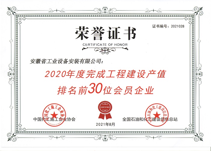 2021年4月,公司迅速行動、充分準備,通過中國化工施工企業(yè)協(xié)會管理系統(tǒng)上報企業(yè)各類資料。近日,經(jīng)過中國化工施工企業(yè)協(xié)會與全國石油和化工建設信息總站匯總評比,我公司榮膺中國化工施工企業(yè)協(xié)會2020年度工程建設產(chǎn)值排名前30位會員企業(yè)。