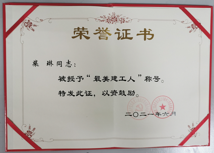 7月1日至7月2日,安徽建工集團控股有限公司二屆一次職工代表大會暨“七一”表彰會在合肥召開。會上表彰了12名“最美建工人”榮譽稱號獲得者,安徽安裝公司柴琳獲此殊榮。