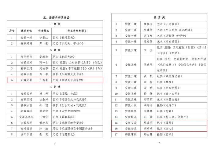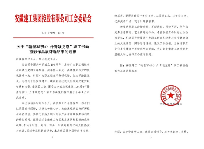 9月29日,集團(tuán)公司工會(huì)通報(bào)了“翰墨寫(xiě)初心 丹青頌黨恩”職工書(shū)畫(huà)攝影作品展評(píng)選結(jié)果,安徽安裝公司選送的五幅作品榜上有名。其中馬金鑫的油畫(huà)作品《支部建在項(xiàng)目上》榮獲繪畫(huà)類一等獎(jiǎng),任禹豪的攝影作品《幸福是干出來(lái)的》榮獲攝影類二等獎(jiǎng),化范寶的硬筆書(shū)法作品《沁園春·雪》和程茂麗的攝影作品《攀登》、胡欣欣的攝影作品《齊心》分別榮獲書(shū)法類優(yōu)秀獎(jiǎng)和攝影類優(yōu)秀獎(jiǎng)。