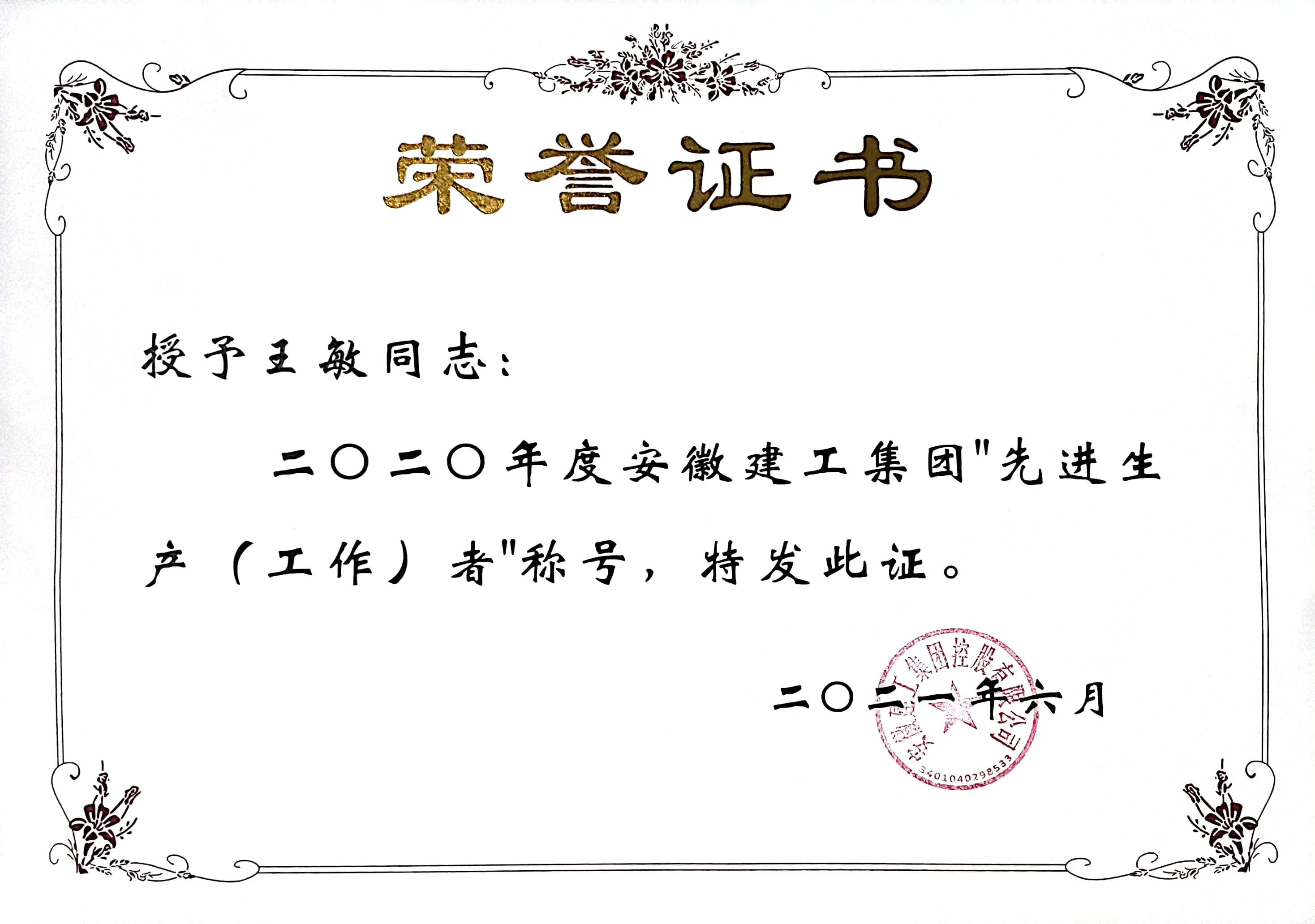 在工作作風(fēng)上,王敏一貫堅(jiān)持對(duì)自己高標(biāo)準(zhǔn)嚴(yán)要求,腳踏實(shí)地,勤奮敬業(yè),認(rèn)真細(xì)致,勤于思考,盡心盡責(zé),主動(dòng)、積極地做好每一項(xiàng)工作,認(rèn)真履行崗位職責(zé)。她時(shí)常告誡自己要以德服人,以身作則,并在實(shí)際工作中努力實(shí)踐著這一思想 ,注重自己的一言一行,公正、客觀,一切從大局出發(fā),不謀私利,不圖己便,廉潔自律,做到自重、自省、自警和自勵(lì)。2021年,王敏由于出色的工作成績(jī),被評(píng)為“安徽建工集團(tuán)2020年度先進(jìn)生產(chǎn)(工作)者”,她說(shuō),這是集團(tuán)對(duì)她過(guò)去工作的肯定,也是對(duì)她未來(lái)工作的要求。