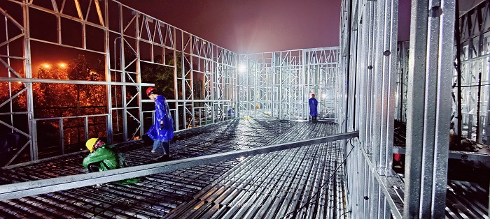 自11月初接到項(xiàng)目任務(wù)以來,面對一個(gè)月完成三層結(jié)構(gòu)方艙醫(yī)院主體機(jī)構(gòu)、內(nèi)部安裝、室外裝飾的極限工期,安徽安裝公司高度重視、精心組織、科學(xué)安排、迎難而上,全力以赴加快工程建設(shè),期間,公司領(lǐng)導(dǎo)多次前往項(xiàng)目現(xiàn)場幫助協(xié)調(diào)解決工程施工中的難點(diǎn)、困難,為項(xiàng)目人員鼓勁加油;公司相關(guān)部門負(fù)責(zé)人駐扎項(xiàng)目一線,指導(dǎo)協(xié)調(diào)內(nèi)部流程、現(xiàn)場施工、外部對接、質(zhì)量安全等一應(yīng)事務(wù);分公司第一時(shí)間組織精干力量進(jìn)入項(xiàng)目現(xiàn)場,梳理現(xiàn)場情況,核對圖紙清單,進(jìn)行施工準(zhǔn)備。從公司領(lǐng)導(dǎo)到項(xiàng)目一線,安徽安裝公司自上而下以高度的使命感和責(zé)任感,投入到緊張的工程建設(shè)中去。項(xiàng)目管理人員披星戴月,從早上到夜間駐守在項(xiàng)目一線,每日召開工程會(huì)議,討論施工工作進(jìn)展,制定下一步工作計(jì)劃,安排交叉作業(yè)工序。為保障夜間施工安全,項(xiàng)目部安排兩名安全員輪流值守項(xiàng)目現(xiàn)場,夜間在項(xiàng)目現(xiàn)場不斷巡查確保施工安全、高效開展。