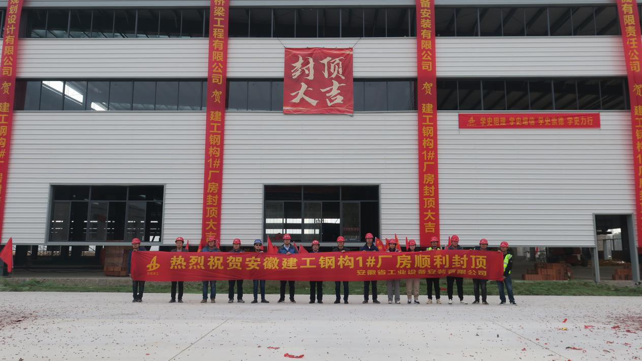 大干四季度,起航再沖鋒。12月8日上午,隨著最后一片屋面板的鋪設完成,合肥分公司建工鋼構項目1#廠房順利封頂,標志著建工鋼構項目主體施工全部完成。安徽路橋橋梁分公司黨總支書記、副總經理劉振嶺、公司總經理助理、合肥分公司黨支部書記、經理趙永峰等出席封頂儀式。與項目部全體員工共同見證這一重要時刻。