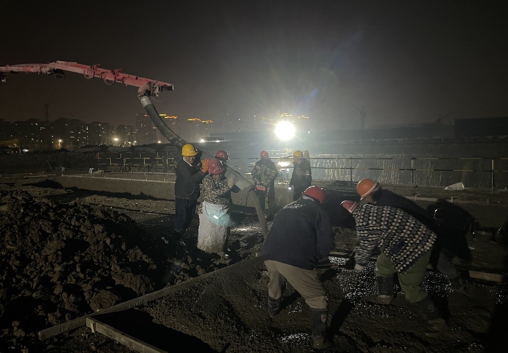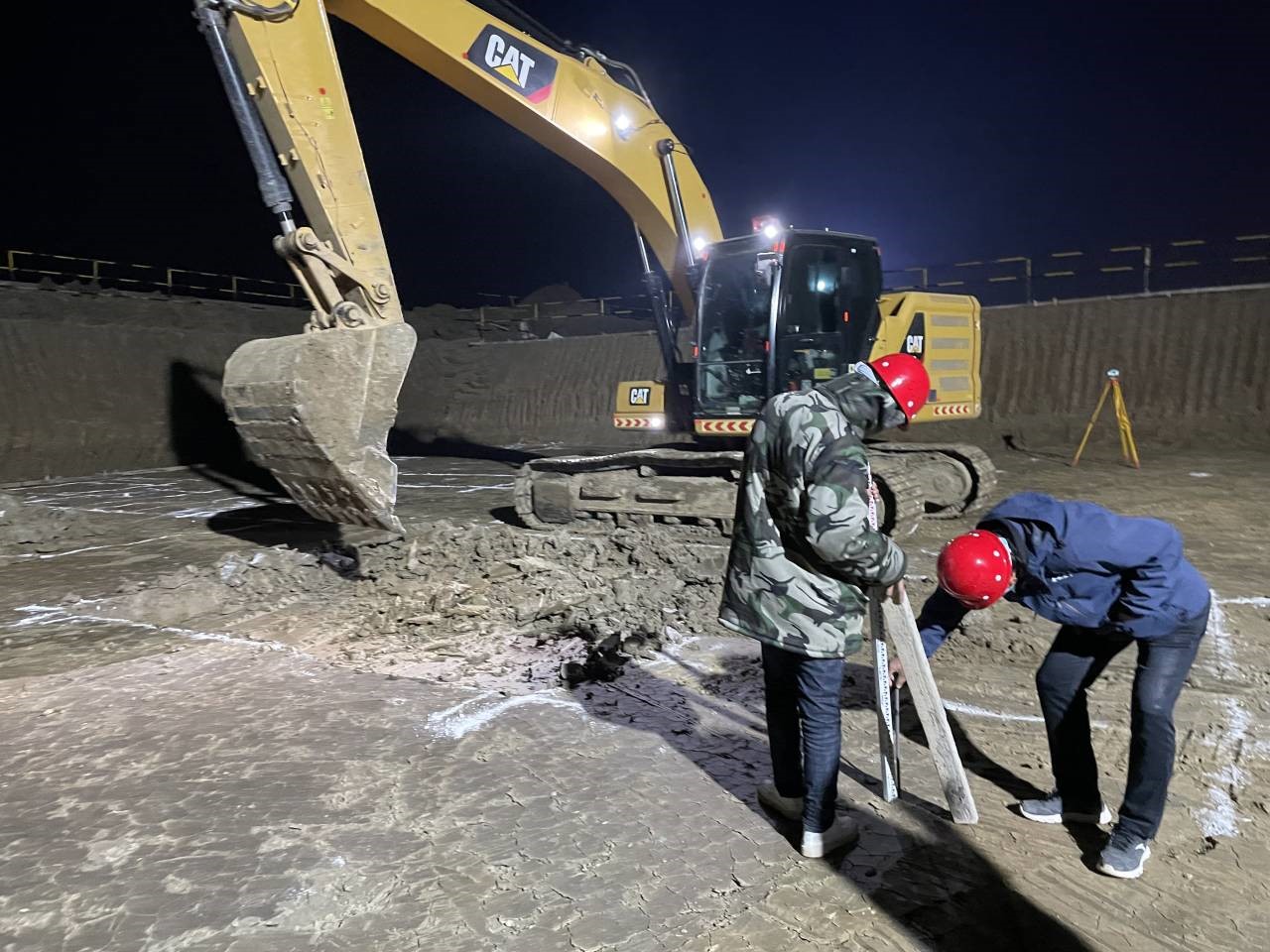 為滿足西動(dòng)力中心承臺(tái)澆筑要求,施工現(xiàn)場(chǎng)燈火通明,項(xiàng)目經(jīng)理徐明東帶領(lǐng)施工員正在認(rèn)真進(jìn)行西動(dòng)力中心承臺(tái)基礎(chǔ)測(cè)量復(fù)核工作。