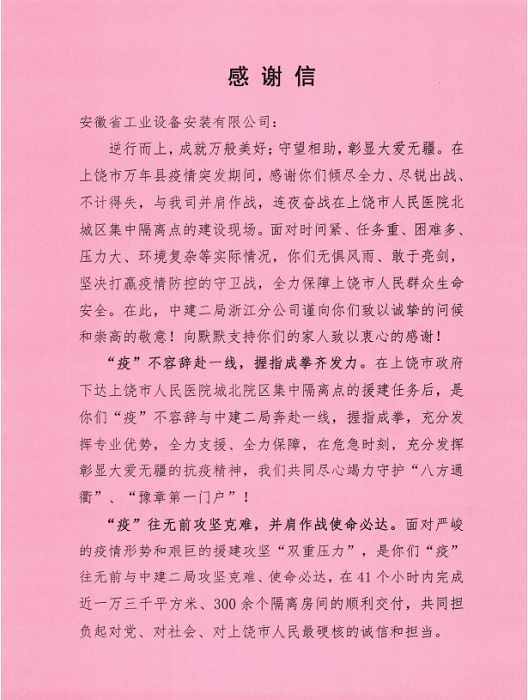近日,安徽安裝公司收到來自中共中建二局浙江分公司委員會的一封感謝信,這是安徽安裝公司參加援建項目以來收到的第2封感謝信。