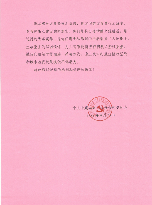信中對安徽安裝公司與中建二局浙江分公司共同援建上饒市人民醫(yī)院北城區(qū)集中隔離點給予高度的肯定和認可。當(dāng)前,新冠疫情形勢嚴峻,安徽安裝公司在嚴格落實屬地疫情防控措施的同時,一方面積極參與本地區(qū)隔離點、醫(yī)院發(fā)熱門診的緊急建設(shè)任務(wù);另一方面攜手相關(guān)行業(yè)兄弟單位同心協(xié)力、援建市外防疫區(qū)域,承擔(dān)起國有企業(yè)社會責(zé)任,竭盡所能地為防疫建設(shè)貢獻最大的力量!