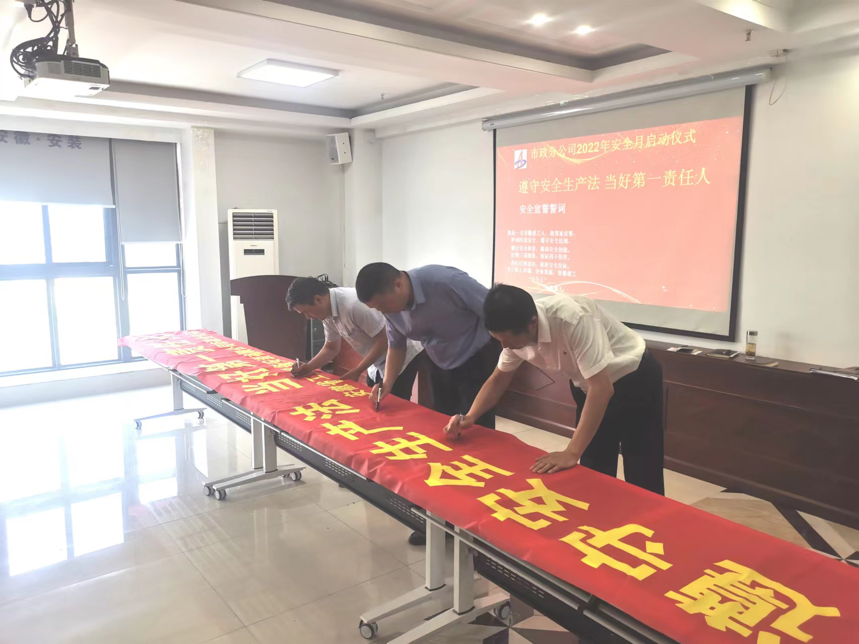 會議開始前首先舉行了市政分公司2022年安全月啟動儀式,分公司副經理黃彥濤宣讀了第一責任人倡議書,作了分公司安全生產月動員講話,與會人員集體安全宣誓,并在安全月主題條幅上簽名。