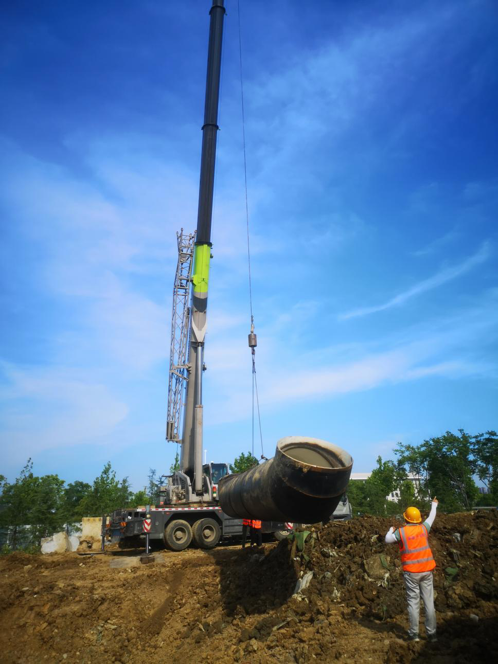 圖為市政分公司四水廠項(xiàng)目80噸吊車正在對(duì)DN1800螺旋鋼管進(jìn)行吊裝
