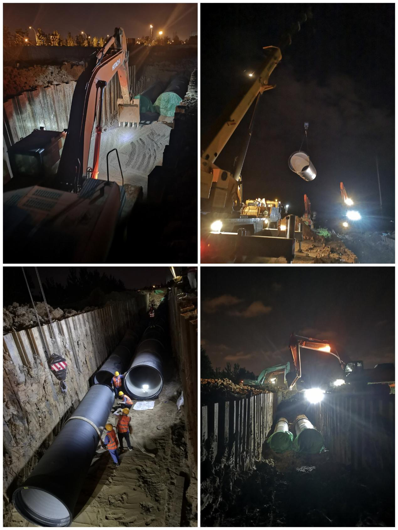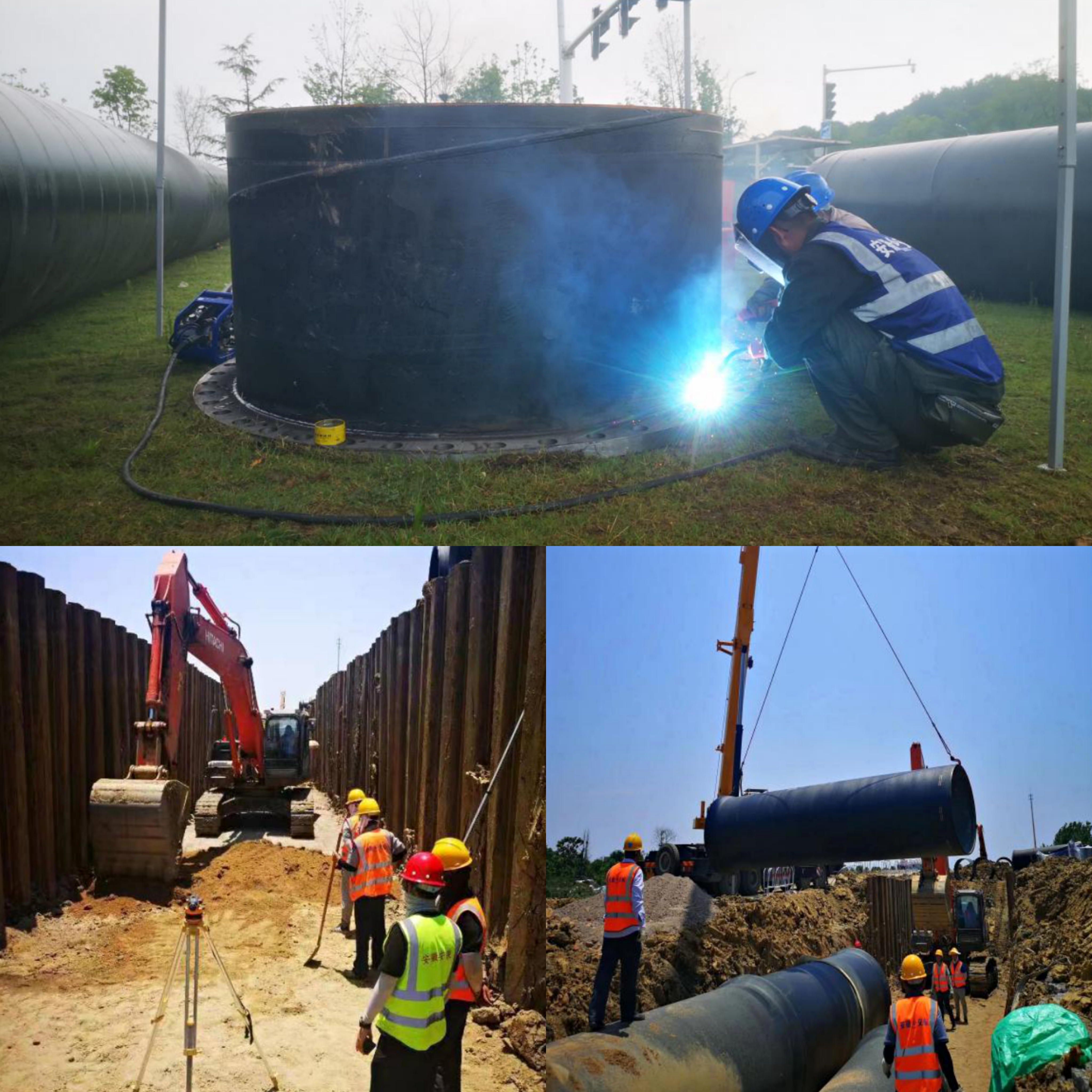 圖為市政分公司四水廠DN1800、DN1400供水管道遷建工程管網(wǎng)項(xiàng)目正在緊張施工。1.焊花綻放、夏季中最美的煙花,2名焊工,正在對(duì)DN1800鋼管與法蘭進(jìn)行焊接(上圖)2. 50噸吊車正在對(duì)DN1800球墨鑄鐵管進(jìn)行吊裝(右下圖);3. 槽底換填、鋪砂墊層(左下圖)