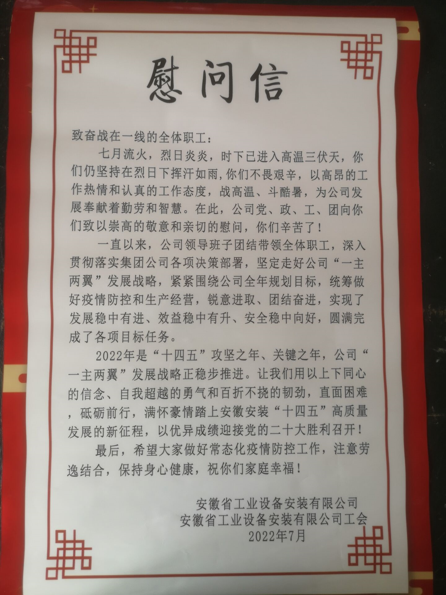 隨后在項(xiàng)目部會(huì)議室,李楊對(duì)集團(tuán)和公司兩級(jí)“十四五”發(fā)展戰(zhàn)略與規(guī)劃進(jìn)行了宣貫解讀。隨后代表公司向奮戰(zhàn)在一線的項(xiàng)目部員工表示慰問(wèn)和感謝,送來(lái)了防暑降溫慰問(wèn)品和慰問(wèn)信,并與項(xiàng)目部員工進(jìn)行了親切交談。在談話中,李楊鼓勵(lì)項(xiàng)目部青年員工和新大學(xué)生要樹立好正確的世界觀、人生觀和價(jià)值觀,在工作中找準(zhǔn)定位,不斷提升業(yè)務(wù)能力,將個(gè)人的進(jìn)步與企業(yè)的發(fā)展緊密地結(jié)合在一起,與企業(yè)共同成長(zhǎng)。