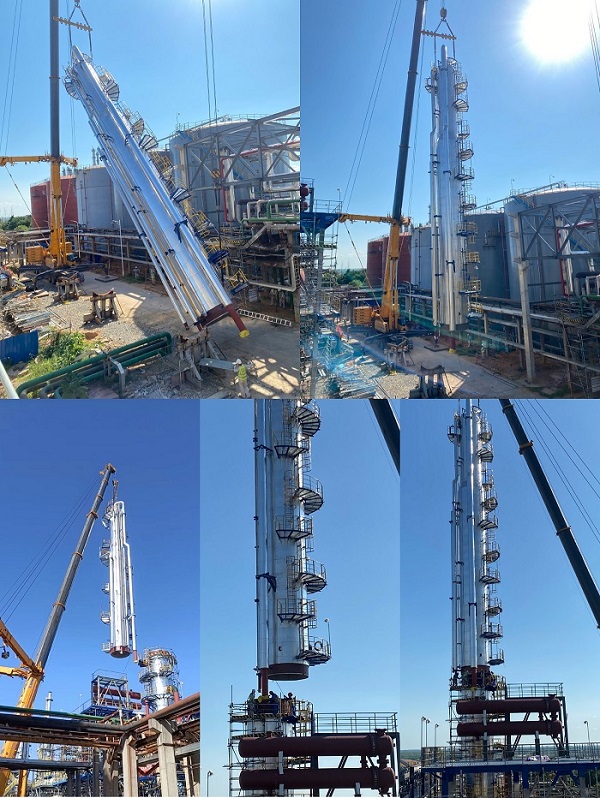 陣陣轟鳴聲中,汽提塔上段在兩臺500噸、160噸吊車的默契配合下緩緩升高,直至完全吊離鞍座。15時48分,汽提塔上段豎立,溜索摘除,由主吊車穩(wěn)步吊向汽提塔下段上方,對準(zhǔn)接口慢慢落下,工人師傅立即上前組對點口,16時12分點口完成。為爭取寶貴時間,項目部實行管理人員輪班制、班組夜間倒班制,通宵焊接作業(yè),于次日中午時分完成組對焊接。為保證組對質(zhì)量,剛焊接完的汽提塔上段還要被吊車“提拎著”靜置12小時以上。最終在8月7日7時48分,隨著主吊車緩緩摘鉤,安慶石化200噸/時污水汽提裝置項目重要節(jié)點——汽提塔上段空中組對完美收官,整個過程歷經(jīng)40個小時。