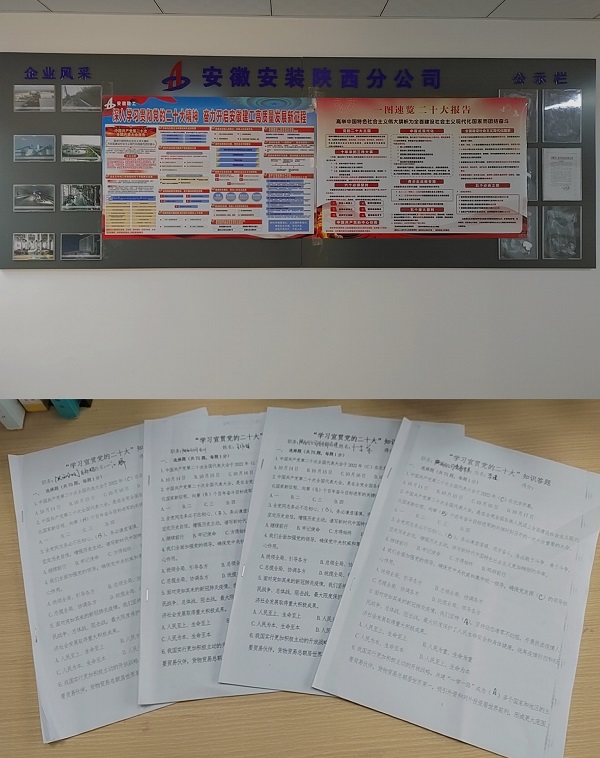 為抓好抓實黨的二十大精神的學(xué)習(xí)宣傳貫徹工作,近期,陜西分公司黨支部以“三會一課”、職工大會的形式組織開展黨員干部職工學(xué)習(xí)黨的二十大精神學(xué)習(xí)研討會;分公司開展“學(xué)習(xí)宣貫黨的二十大”知識答題活動,以考促學(xué),以學(xué)促知,以知促用,充分檢驗學(xué)習(xí)效果;通過制作黨的二十大精神宣傳圖,開展立體式廣泛宣傳,推動大會精神深入職工群眾;通過開展一系列特色學(xué)習(xí)教育與宣傳活動,切實把黨的二十大精神帶到職工群眾身邊,為提高黨員干部職工對黨的二十大精神的全面掌握與學(xué)習(xí)起到促進(jìn)作用,使黨的二十大精神成為分公司各項工作發(fā)展的思想與行動綱領(lǐng)。