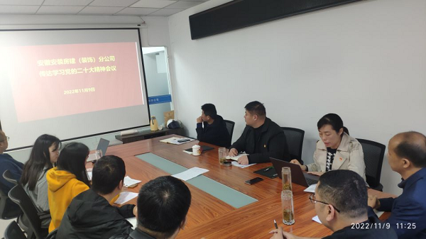 11月9日上午,房建(裝飾)分公司黨支部組織全體黨員、在肥干部職工、項目經(jīng)理召開學(xué)習(xí)研討黨的二十大精神專題會議。會議要求,全體干部職工要統(tǒng)一思想,凝心聚力,把學(xué)習(xí)二十大精神與與分公司實際工作相結(jié)合,對照年初各項指標(biāo)任務(wù),努力強(qiáng)弱項,補(bǔ)短板,狠抓落實,推動分公司各項工作上臺階。