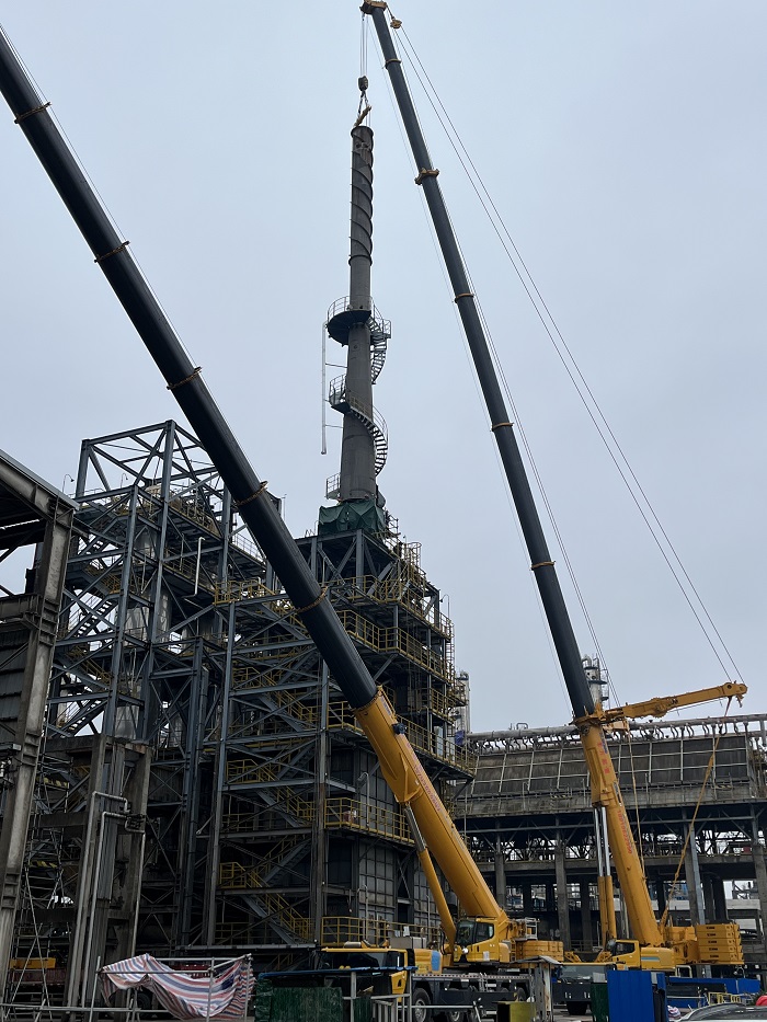 該項目原有煙囪吊耳主軸低于規(guī)范要求,存在安全隱患,因此在本次檢修期間重新制作并利用吊籠在高空焊接安裝吊耳。該煙囪及附件整體重約50噸,設備位于25米框架頂,煙囪長35米,煙囪頂部距地面60米,受施工空間影響,采用動態(tài)施工的組織方法,利用500T吊車主吊與130T吊車溜尾、高空組對焊接及分段吊裝等技術確保該煙囪順利吊裝。