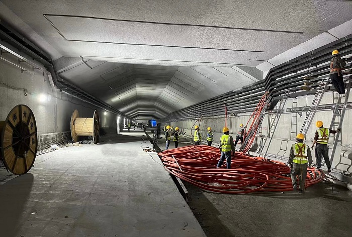 目前,項(xiàng)目下穿隧道東、西側(cè)1#2#配電房一次性送電成功,能夠提供隧道現(xiàn)場施工用電,東側(cè)雨水泵房和中間廢水泵房已完成施工任務(wù),隧道里的橋架安裝、電纜敷設(shè)、消防水管安裝、照明燈具安裝及各附屬設(shè)施安裝建設(shè)也正在加速進(jìn)行當(dāng)中。