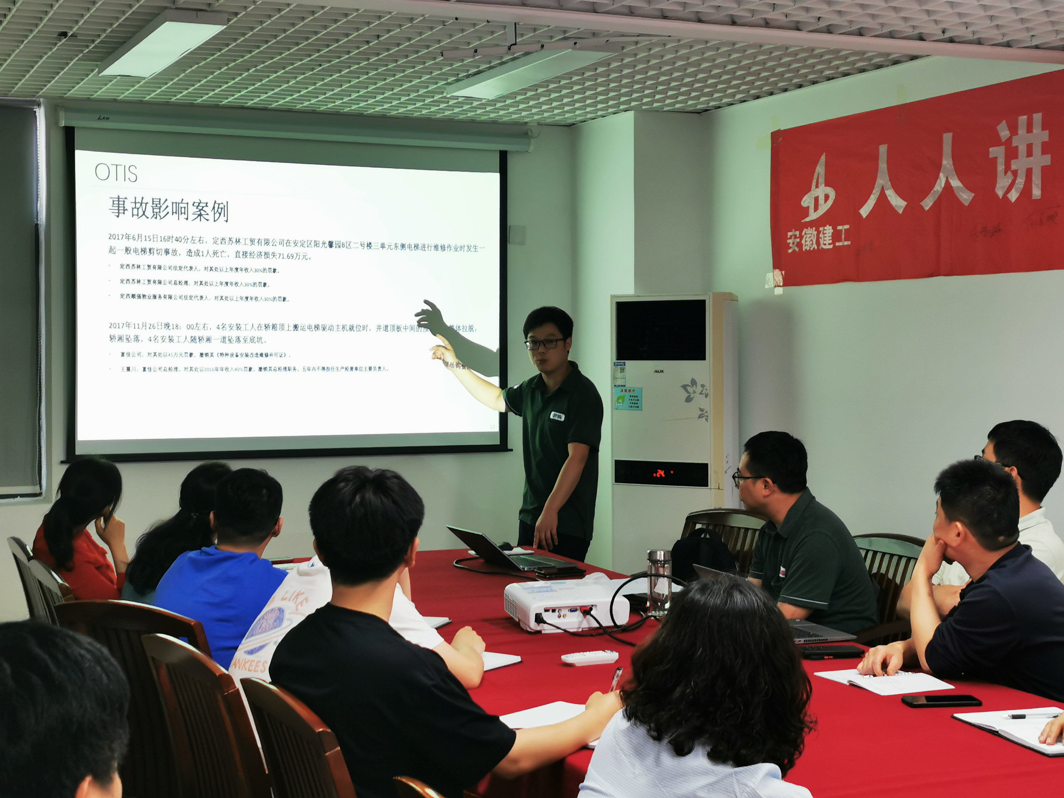 培訓(xùn)由奧的斯電梯(中國)有限公司安徽分公司安全工程師徐長江、項(xiàng)目經(jīng)理張文翔及調(diào)試工程師王威為大家授課。三位授課老師結(jié)合多年從事電梯行業(yè)的經(jīng)驗(yàn),從安全管理責(zé)任、安全教育培訓(xùn)、安全事故案例分析、電梯安裝調(diào)試中易錯點(diǎn)及電梯安裝行業(yè)容易導(dǎo)致重傷及死亡事故的原因等方面全面、系統(tǒng)地講解了電梯施工現(xiàn)場容易出現(xiàn)的各類安全隱患,深度剖析了隱患可能引發(fā)的各類安全事故,各種事故隱患的防護(hù)措施及在發(fā)生緊急情況時如何做好事故處理等。