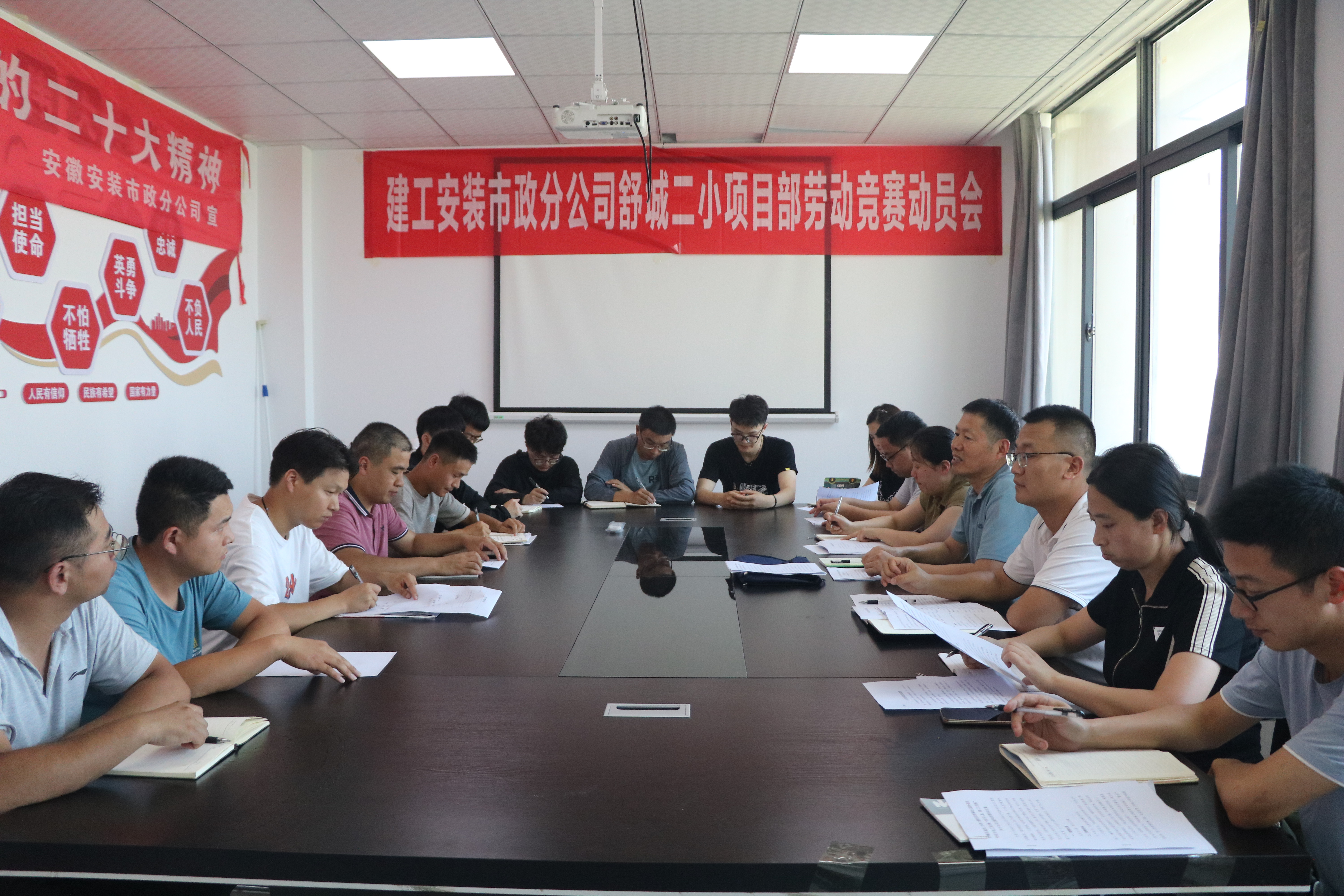 7月10日上午,市政分公司舒城縣城關(guān)二小緯二路校區(qū)及附屬幼兒園項(xiàng)目部舉行勞動競賽動員會,并組織開展勞動競賽大討論,正式拉開項(xiàng)目部“當(dāng)好主人翁,建功大發(fā)展”大干20天,全面完成室外強(qiáng)電專業(yè)分包工程施工任務(wù)主題勞動競賽活動序幕。分公司黨支部書記胡迎東、副經(jīng)理解保及分公司勞動競賽領(lǐng)導(dǎo)小組成員出席會議,項(xiàng)目部全體管理人員及施工班組代表參會。會議由分公司工會副主席張曼主持。