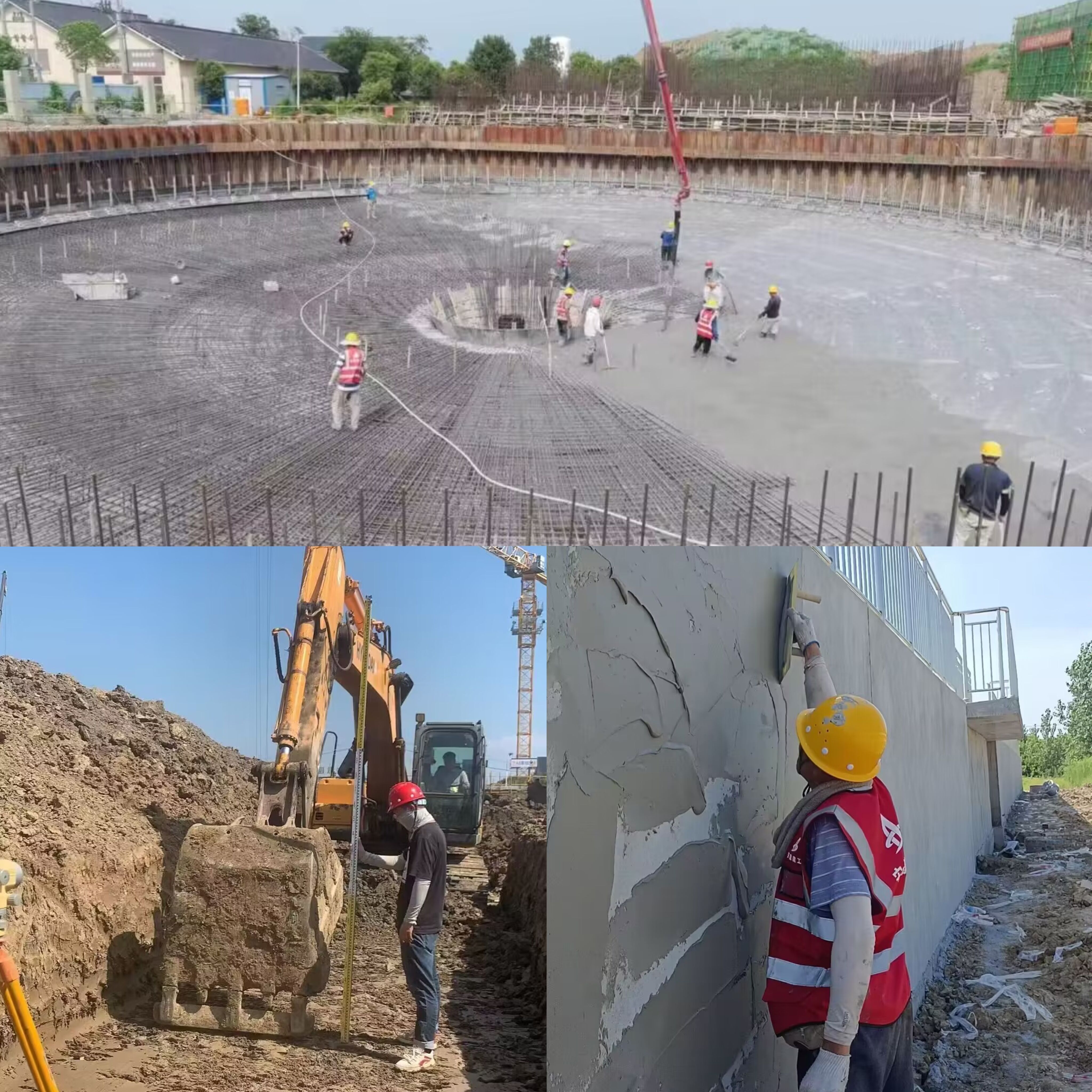 圖為:阜南城南污水處理廠改擴建及配套管網(wǎng)工程二沉池筏板混凝土澆筑、配電房基礎(chǔ)開挖及均質(zhì)池外墻粉刷施工