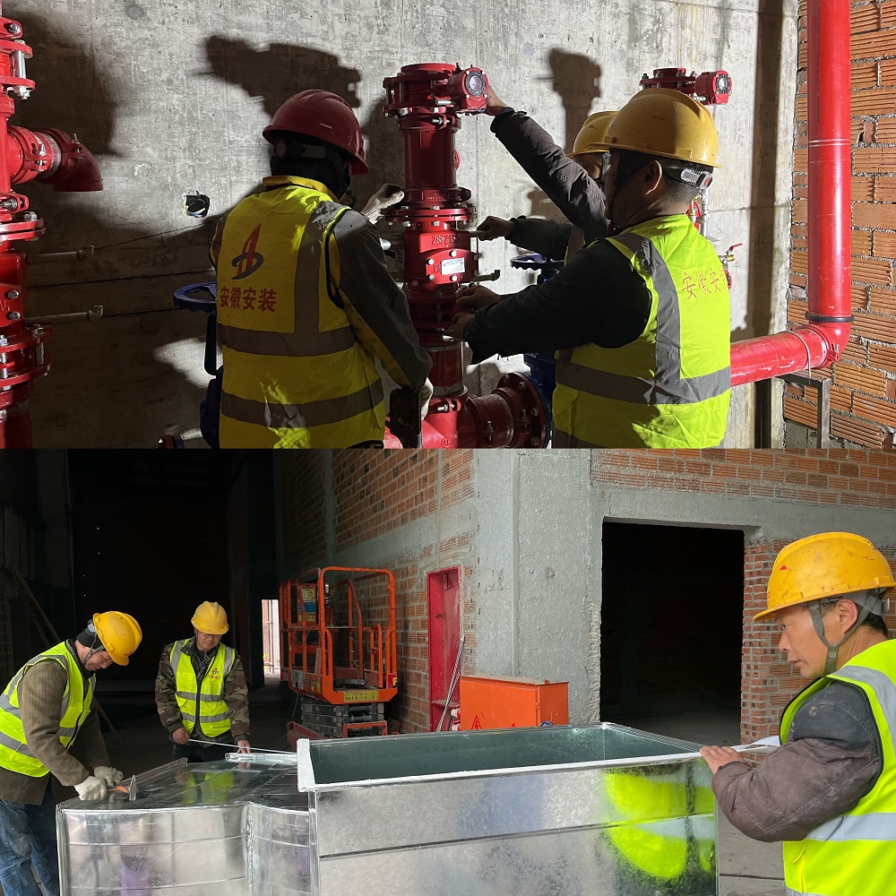 圖為:岳西中學(xué)建設(shè)項(xiàng)目(一期)安裝專業(yè)分包工程項(xiàng)目正在進(jìn)行地下室濕式報(bào)警閥安裝、體育館風(fēng)管加工