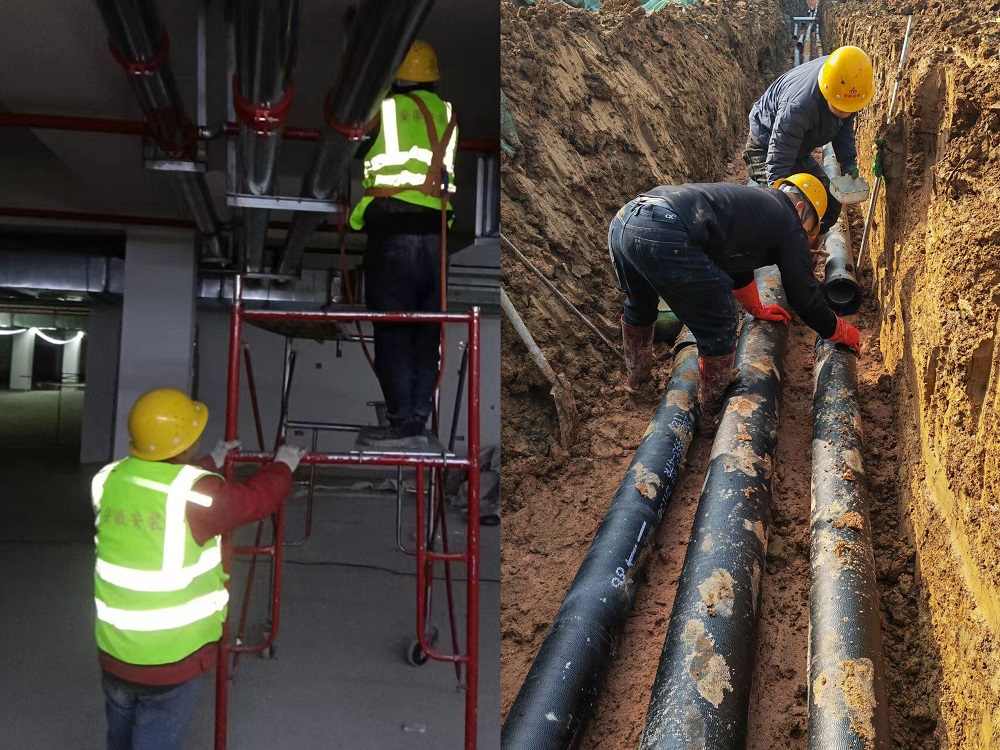 圖為:合肥高鐵路初中及高鐵路小學(xué)項(xiàng)目正在進(jìn)行室內(nèi)消防管道安裝,室外給水管網(wǎng)施工