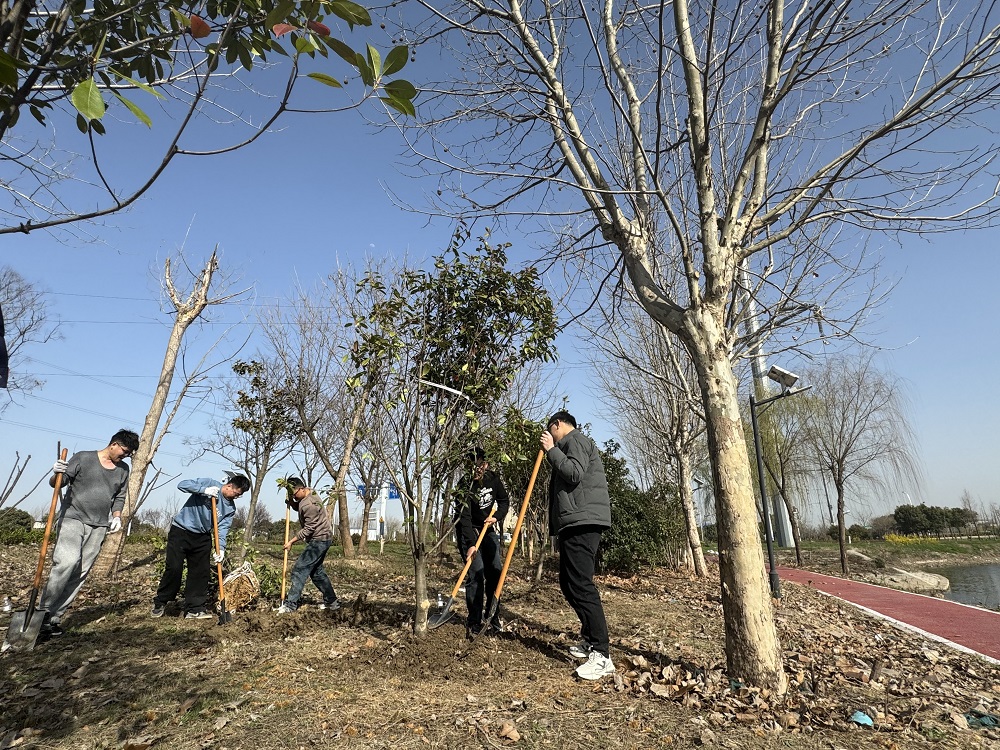 植樹現(xiàn)場(chǎng),團(tuán)員青年們熱情高漲、干勁十足。大家通力協(xié)作、揮鍬鏟土、踏土夯苗、提水澆灌,忙的不亦樂(lè)乎。經(jīng)過(guò)一番辛勤勞動(dòng),多株翠綠的樹苗迎風(fēng)而立,一片勃勃生機(jī)的景象,為河岸再添新綠。