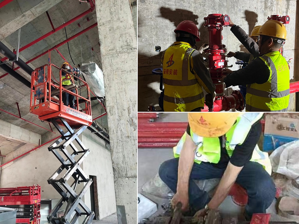 圖為電氣班組穿線、消防班組濕式報警閥安裝、消防班組管道預制