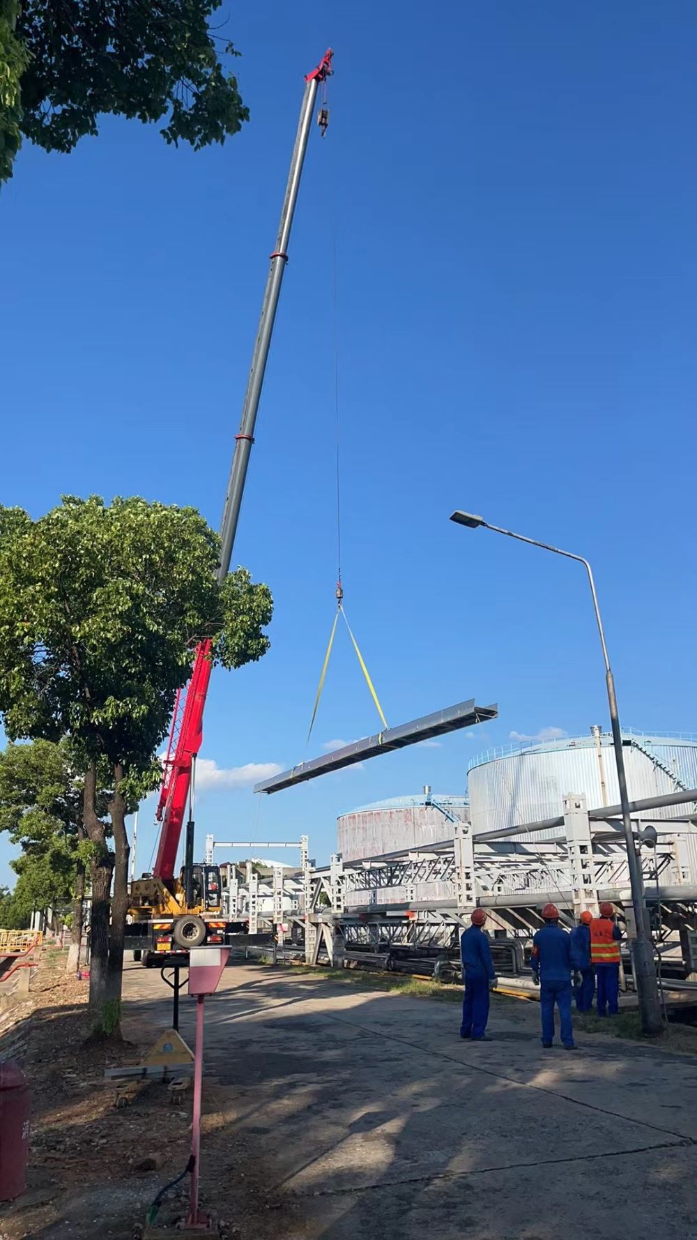 8月1日,該項(xiàng)目進(jìn)行電纜槽盒托架吊裝工作,該電纜槽盒托架采用18米每段進(jìn)行吊裝,先集中預(yù)制后到現(xiàn)場(chǎng)管廊處進(jìn)行對(duì)接后在吊裝至管廊上。該托架重量約0.6噸,使用1臺(tái)25噸吊車(chē),將整段托架吊至上方,并對(duì)接安裝連接成一個(gè)整體。在項(xiàng)目部全體人員的共同努力下托架順利吊裝到位,該托架吊裝完成標(biāo)志著此項(xiàng)目安裝工作進(jìn)入尾聲,為項(xiàng)目按時(shí)完工奠定了良好的基礎(chǔ),目前正在進(jìn)行電纜橋架吊裝和電纜鋪設(shè)工作。