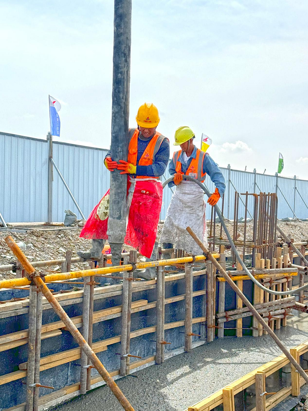 該項目施工現(xiàn)場人頭攢動,機械轟鳴,駐場技術(shù)人員頭頂烈日、靠前指揮,施工工人往來穿梭,或支設(shè)模板,或綁扎鋼筋,與夏競速,“激戰(zhàn)”正酣。項目工期緊任務(wù)重,為搶進(jìn)度、嚴(yán)安全、保工期、抓質(zhì)量,項目部嚴(yán)格制定施工進(jìn)度計劃,統(tǒng)籌安排施工人、材、機,合理高效進(jìn)場施工作業(yè),目前項目正在進(jìn)行變電所及廠房的基礎(chǔ)工程。