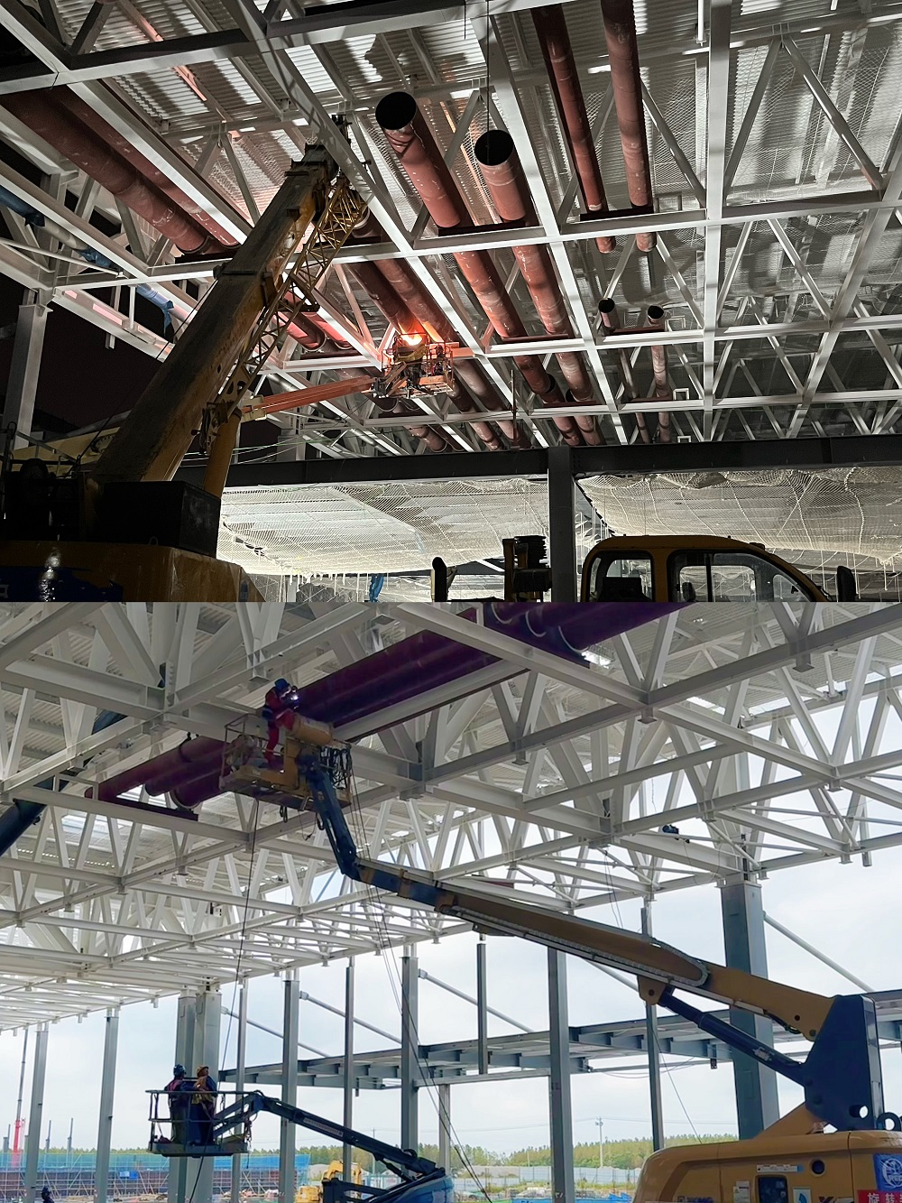 該項目本階段正在進行各車間直徑DN700、DN800的空調冷凍水管道吊裝搶工。為了能早日完成空調冷凍水管道吊裝的工程節(jié)點目標,項目管理人員以工期進度為主線,多次召開技術商討會,合理優(yōu)化吊裝施工方案,全體員工實行24小時輪班工作制,夜晚輪流值班,晝夜奮戰(zhàn)、奮勇爭先,發(fā)起項目加速建設的“最強攻勢”。