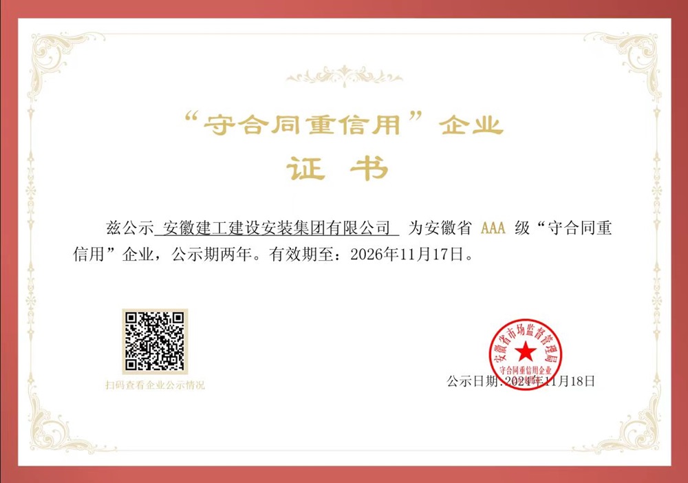 喜報(bào)!建工安裝獲評(píng)安徽省AAA級(jí) “守合同重信用”企業(yè)