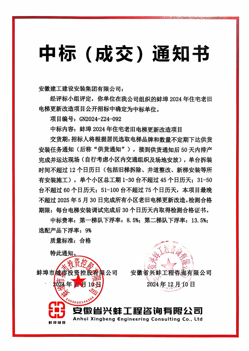 12月10日,建工安裝電梯分公司成功收到蚌埠2024年住宅老舊電梯更新改造項目中標通知書!